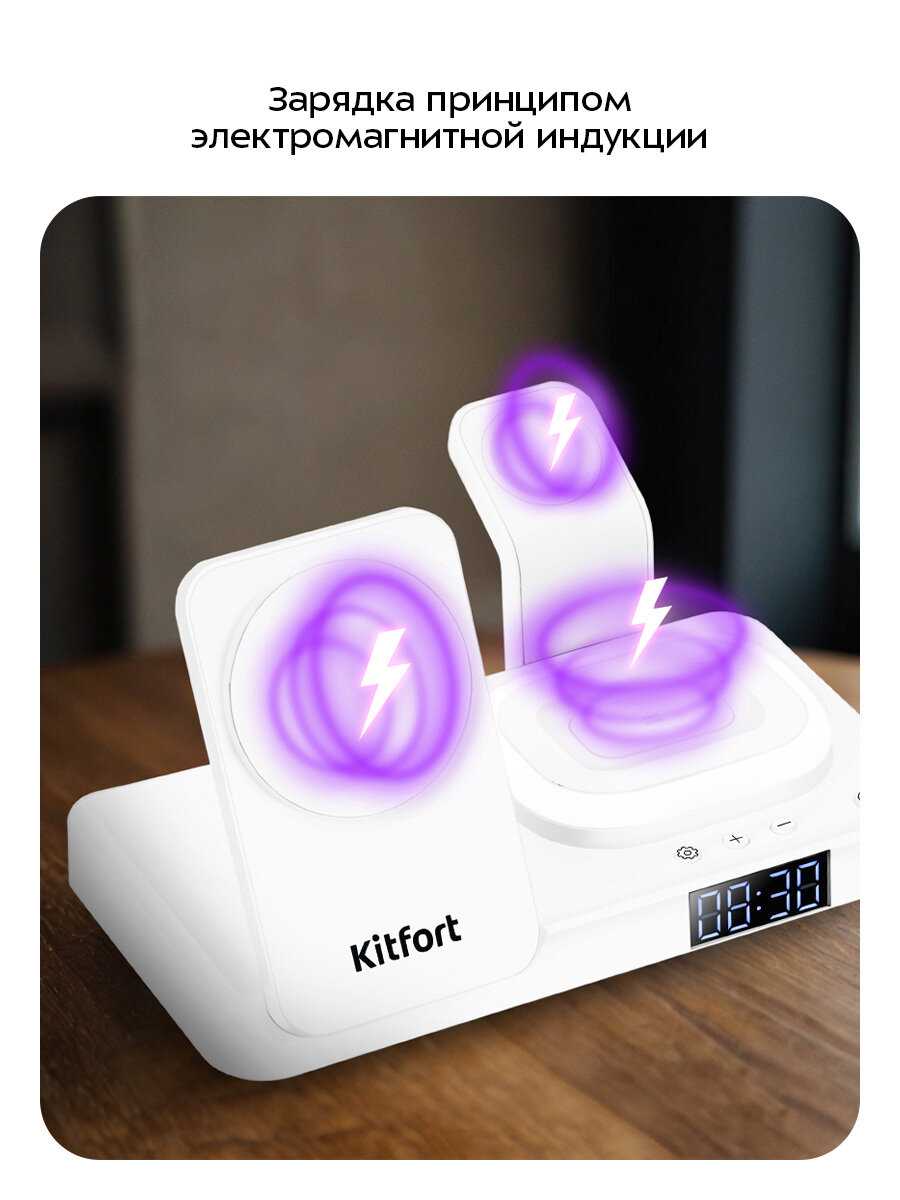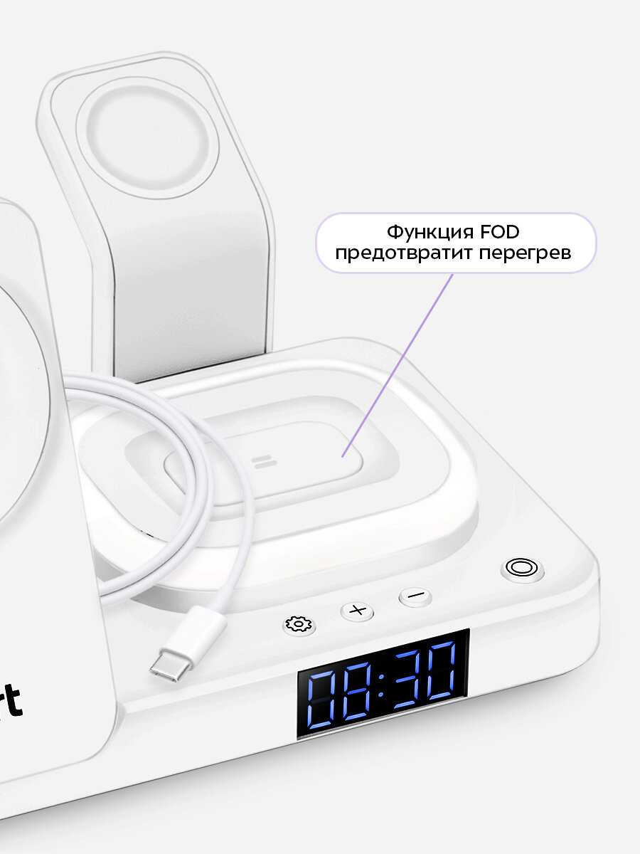 Приобрела данную станцию в подарок. Порадовала цена (выпал купон на скидку в 20%). Привезли быстро, упаковка целая, очень много подарков внутри. Сама зарядная станция стильная, вписалась в интерьер. Подсветка имеет 3 режима. Часы на станции не лишние. Заряжает не скажу, что быстро, при условии, что на станции висел только телефон. Но я обычно заряжаю ночью
