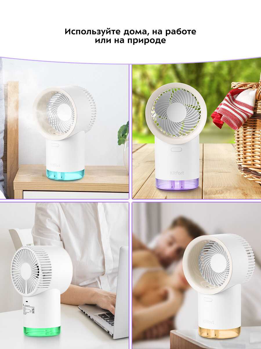 Вентилятор работает хорошо, практически бесшумно. В комплекте зарядное устройство. Подсветка горит разными цветами. Их плюсов работает во время подзарядки. Достаточно компактный, подойдёт для дома или офиса. Может работать как вентилятор и как увлажнитель как вместе так и по отдельности