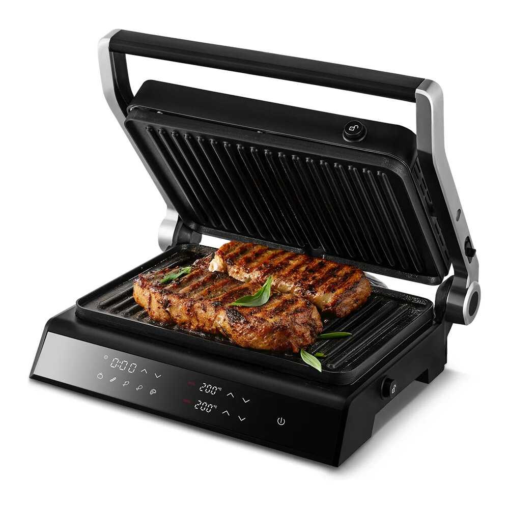 - + покупал два гриля китфорт, оправдал мои ожидания, регулируется высота крышки, это очень удобно. быстро нагревается, еда не пригорает, жир стекает в чашу для жира. разбирается для мытья очень легко.