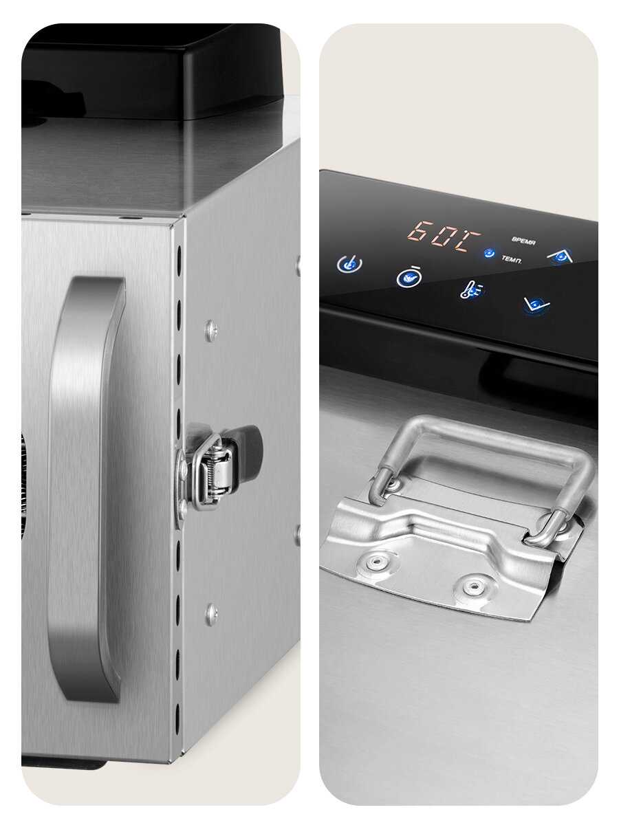 - + Сушилка сушит продукты равномерно благодаря горизонтальному обдуву, что позволяет добиться хорошего результата без перепадов. По завершении цикла она подает громкий звуковой сигнал и автоматически отключается, что удобно и безопасно. Управление через сенсорную панель получилось простым и понятным, разобраться получилось быстро без лишних усилий. Корпус из металла выглядит солидно и внушает уверенность в долговечности, хотя дизайн не самый изысканный. Устройство компактное, его легко поставить на любой кухонный стол без проблем с пространством. В комплекте есть таймер для точного контроля времени, а также возможность регулировать температуру с шагом в 5 градусов, плюс приятный бонус в виде магнита от производителя.