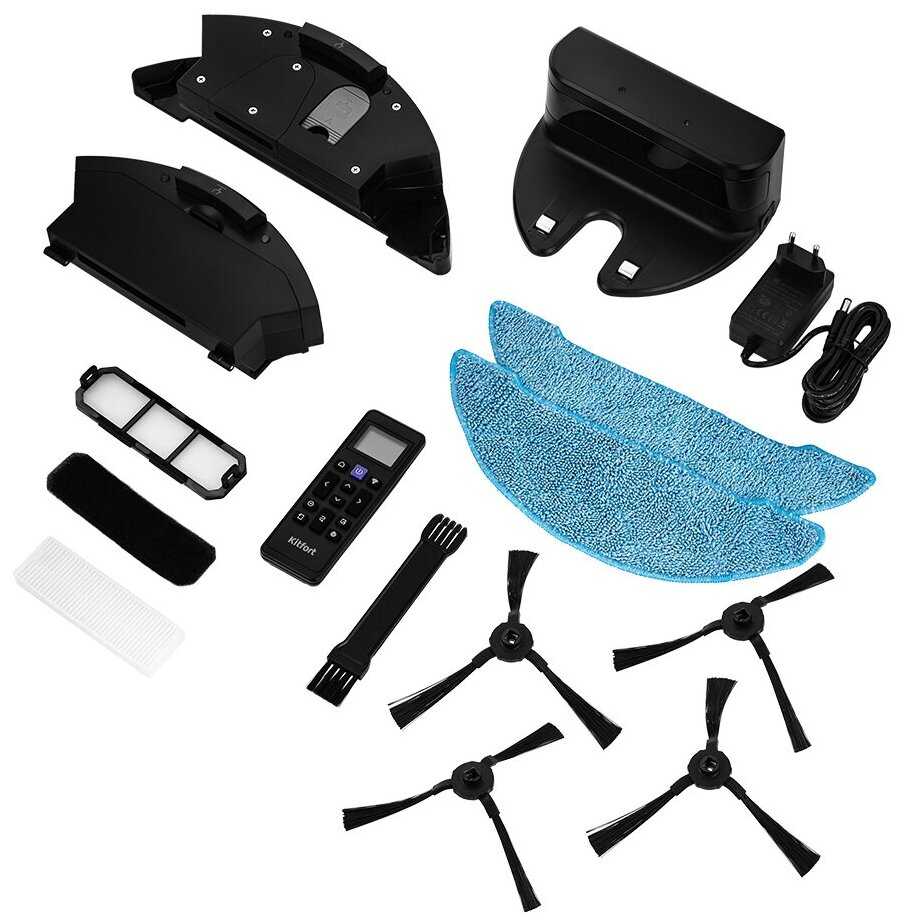 В комплекте есть дополнительные сменные щётки, резервуар для влажной уборки. Инструкция очень детальная, как для установки приложения, так и для работы без него. Если вам лень скачивать и регистрироваться, есть пульт для управления с теми же функциями.