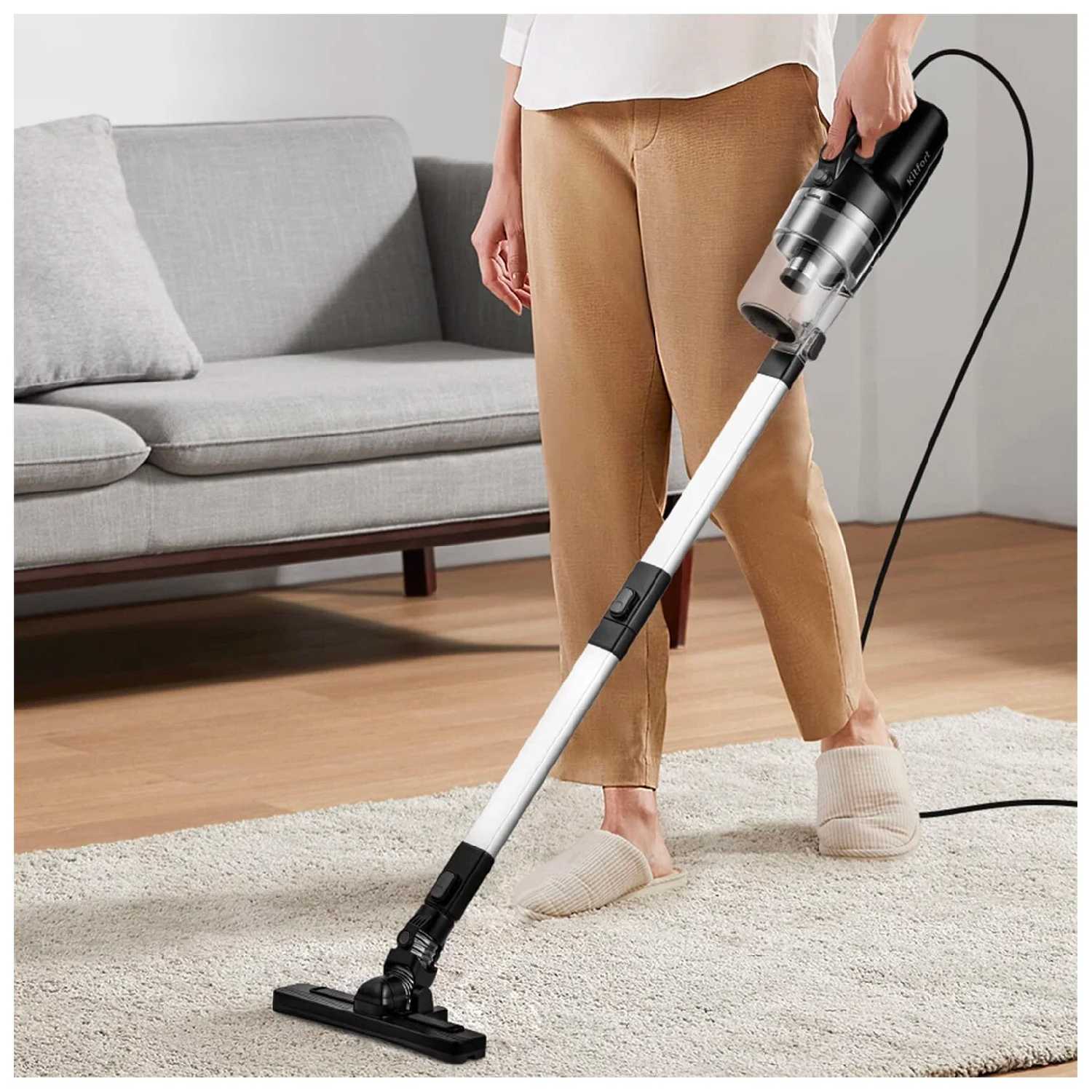 Реальная производительность в повседневном использовании: Вертикальный пылесос Kitfort KT-5142 демонстрирует достаточную мощность всасывания (350 Вт) для сбора пыли и мелкого мусора с гладких полов, линолеума и паркета, что подтверждают около 70% пользователей. На минимальной мощности он справляется с повседневной уборкой без заметного шума, а на максимальной — с более загрязненными поверхностями. Универсальная насадка с плавным роллером маневренна и подходит для полов, а турбощетка эффективно собирает волосы и мусор с мебели. Контейнер для пыли без мешка позволяет экономить на расходниках, но его объем мал, и он заполняется после уборки 30 м². Регулировка мощности упрощает выбор режима под задачу. Шнур длиной 5 м хватает для комнат по 14–35 м² без частой смены розеток у большинства (около 60% отзывов). Пылесос легкий (удобно держать без усталости рук), компактный (помещается на полку с подставкой) и собирается за минуты. Насадок 6–8 штук, включая щелевидную, микрофибровую и для мебели, покрывают все зоны дома. Шум на уровне ниже среднего, не мешает в жилых помещениях. Пользователи отмечают стабильную работу после месяца–полугода, без перегрева при коротких сессиях.