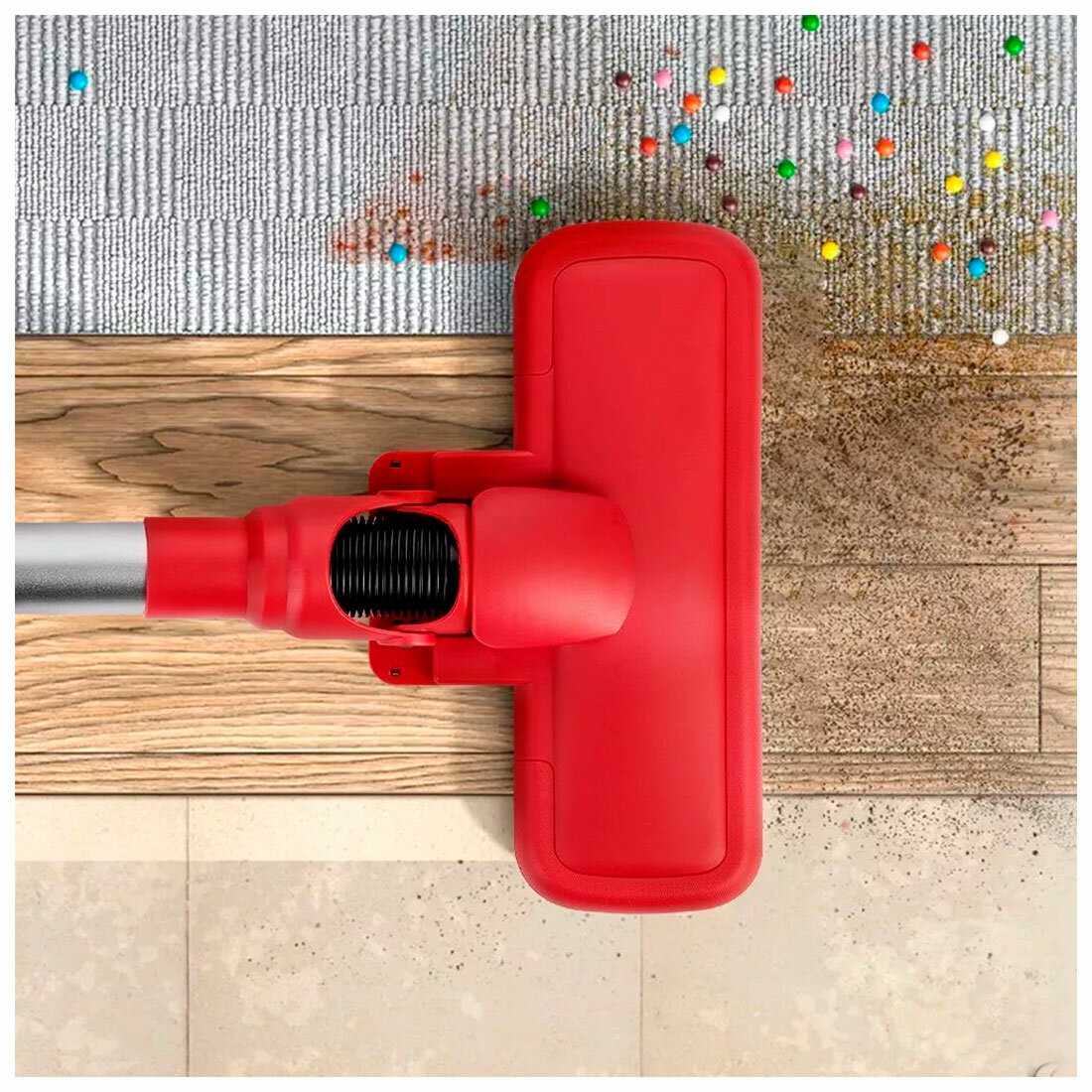 - + Лёгкий и мощный. Отлично убирает пыль из углов благодаря насадкам и мощности. Очень удобно пылесосить не только пол, но и шкафы и столы за счёт того, что можно использовать маленькую насадку.