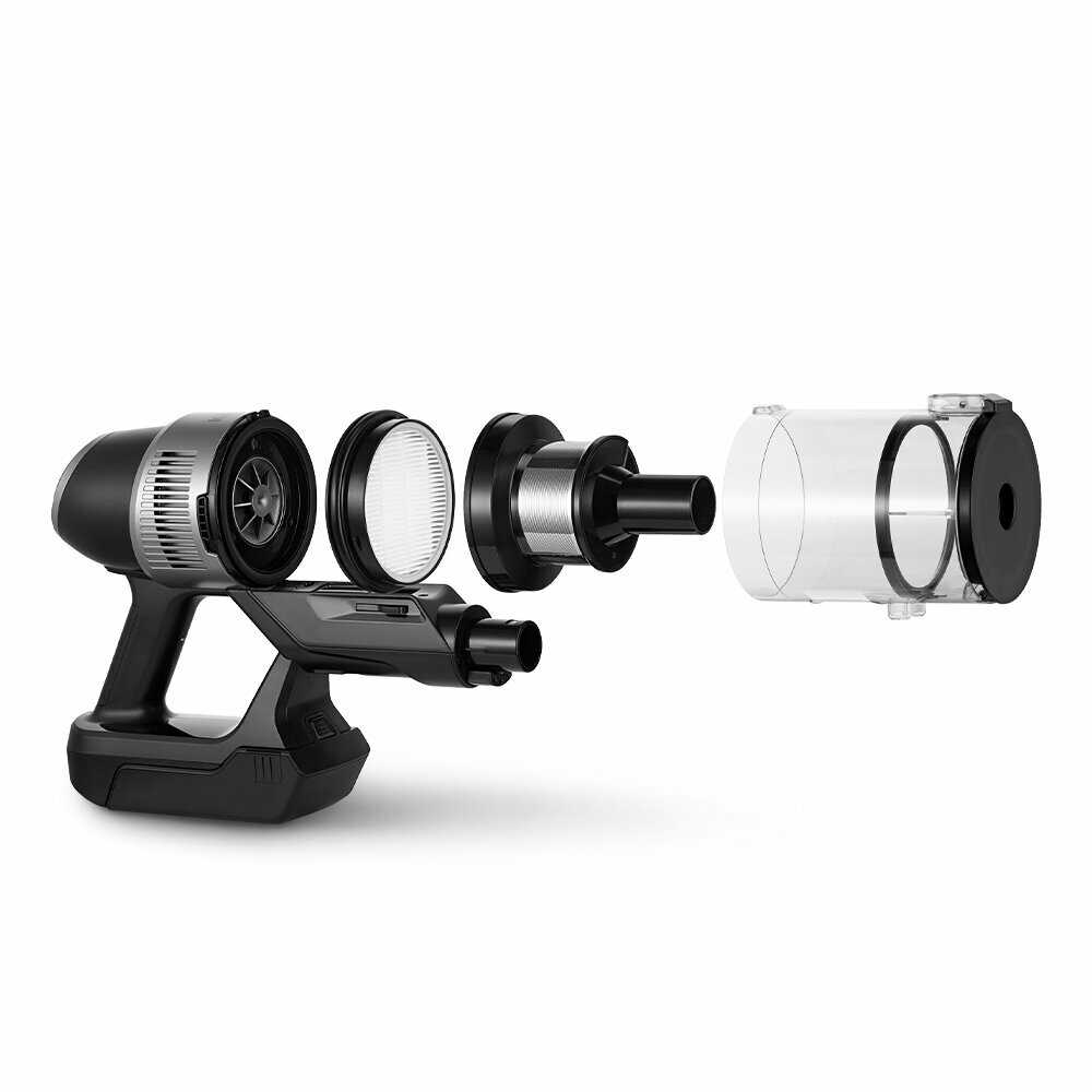 Контейнер легко снимается и очищается нажатием кнопки, вытряхивая мусор. Стакан моется, фильтры съёмные. Пользователи отмечают простоту обслуживания. Вес аккумулятора рядом делает вытряхивание тяжеловатым для некоторых. Нужно правильно собирать конструкцию, иначе не закрепится. В целом процесс быстрый и удобный. -