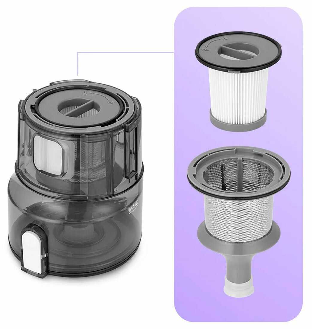 - Система очистки контейнера с кнопочным механизмом упрощает удаление собранного мусора без контакта с пылью.