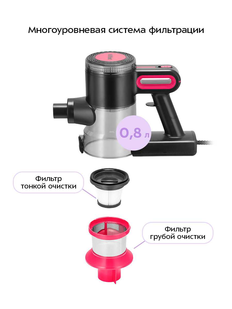 - + Мощность всасывания просто потрясающая, справляется с любым мусором без проблем. Устройство довольно лёгкое, рука во время уборки не устаёт, плюс оно манёвренное, легко поворачивается и доходит до труднодоступных мест. Внешний вид привлекательный, смотрится стильно. В комплекте идёт кронштейн для хранения, что удобно и помогает держать всё в порядке.