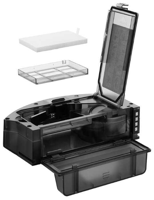 - Вместительный контейнер (0.6 л) собирает много мусора, автоматически возвращаясь на базу при заполнении.