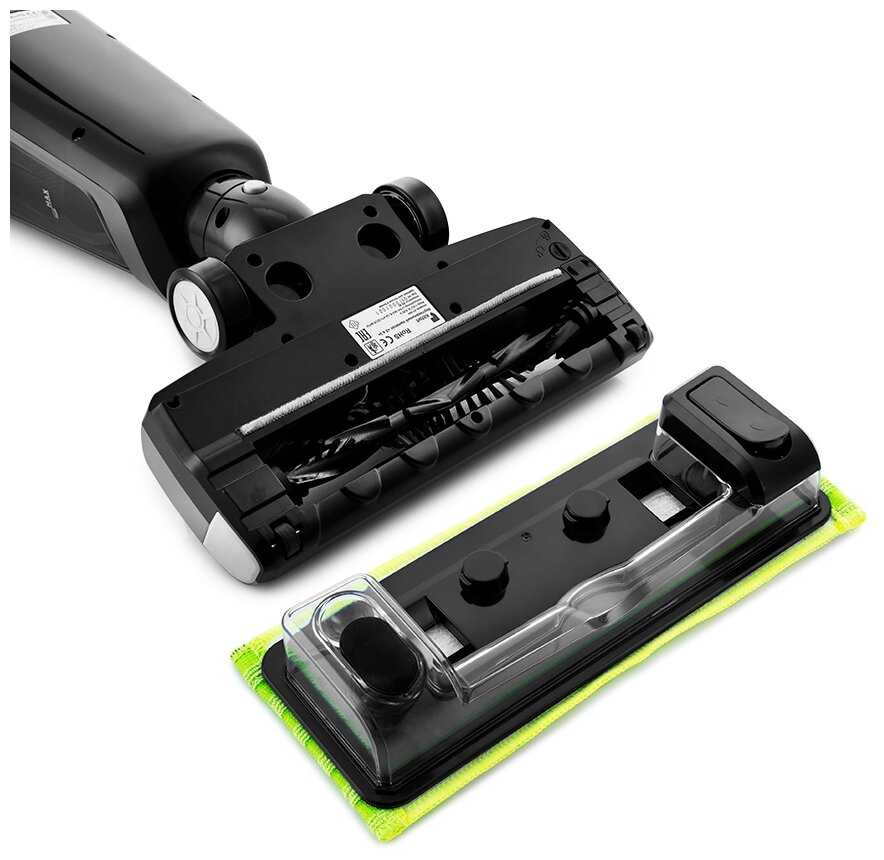 - Насадка с резервуаром для воды и тряпкой на липучках освежает полы, собирает пыль и протирает одновременно.