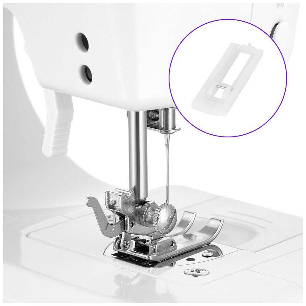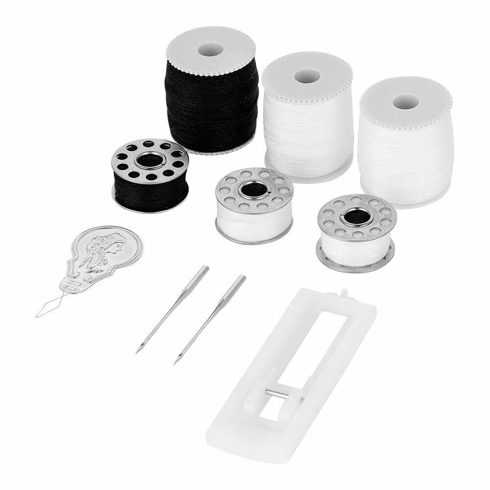 В комплекте идут 3 иглы, 3 шпульки с ниткой, 3 катушки с ниткой, лапка для петель, нитевдеватель.