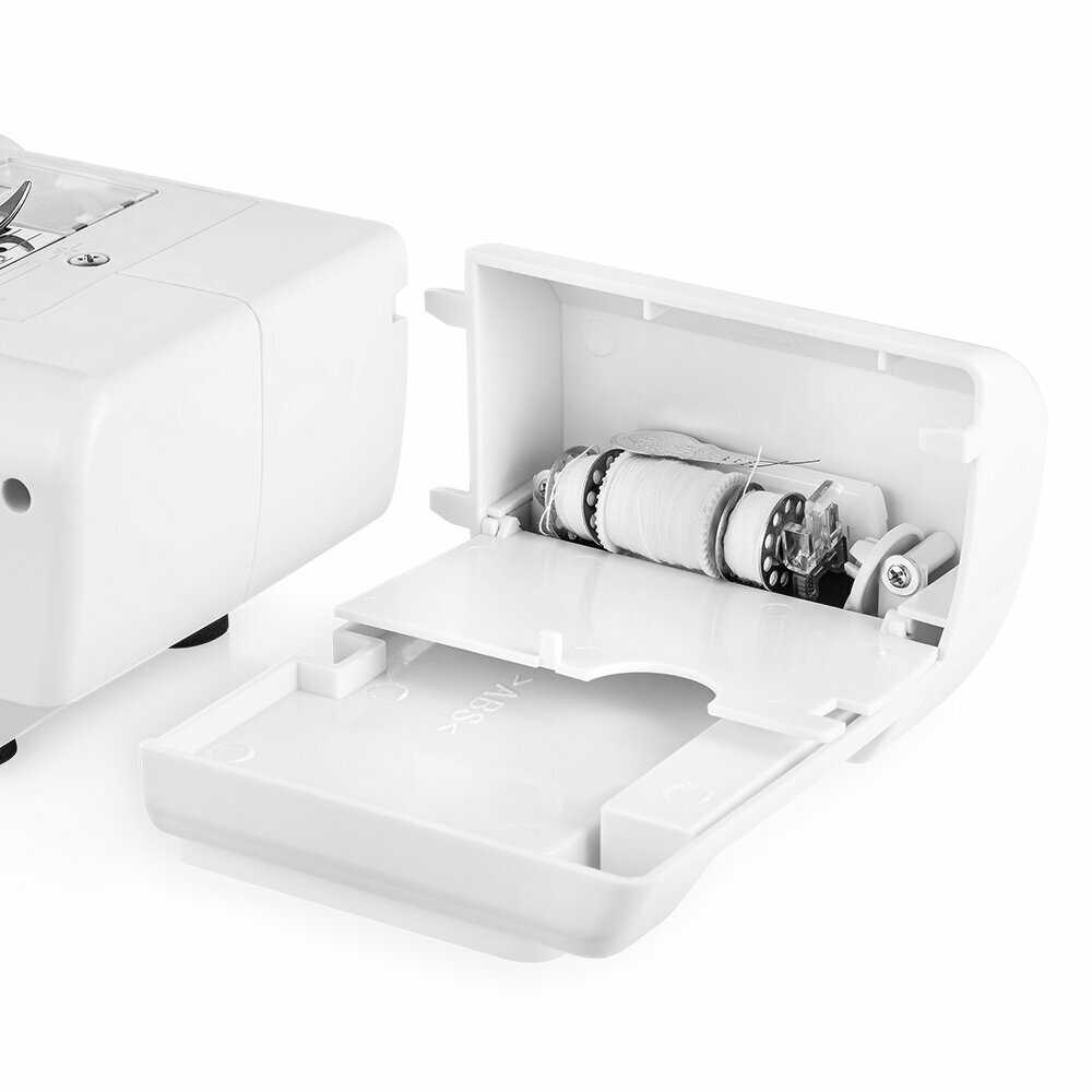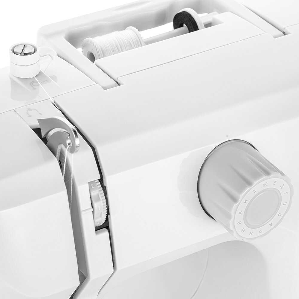Стандартная поставка включает 6 шпулек с нитками (4 белые, 2 чёрные), лапки, нитковдеватель и двойную иглу — это оценят начинающие. Наличие нитки в заправленной игле при распаковке упрощает первый запуск. Работа от батареек — необычная опция, позволяющая шить в условиях без доступа к розетке. Однако отсутствие запасных игл в комплекте и малый размер отсека для аксессуаров усложняют хранение мелочей. Прозрачная крышка челночного отсека упрощает контроль за нижней нитью, а автоматический нитеобрезатель экономит время. При этом ручная намотка шпульки (из-за проблем с автоматикой у некоторых пользователей) остаётся слабым местом.