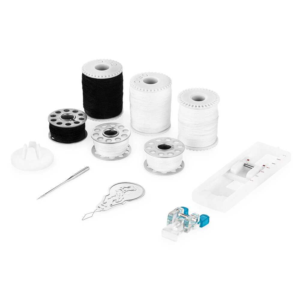 - 6 металлических шпулек с предустановленными нитями, лапка для петель, двойная игла, нитковдеватель.