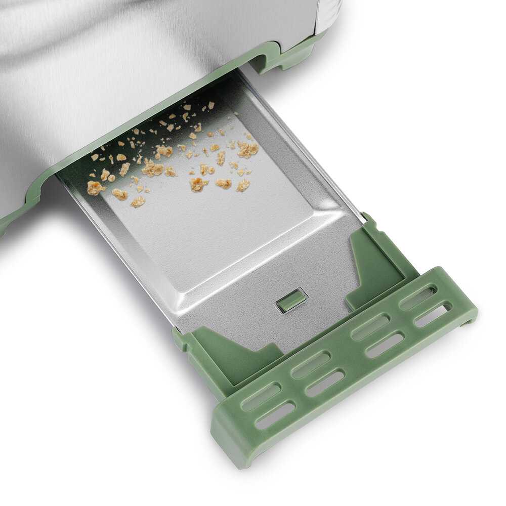 - Съемный поддон для крошек упрощает очистку прибора – достаточно выдвинуть контейнер и вытряхнуть остатки после использования.