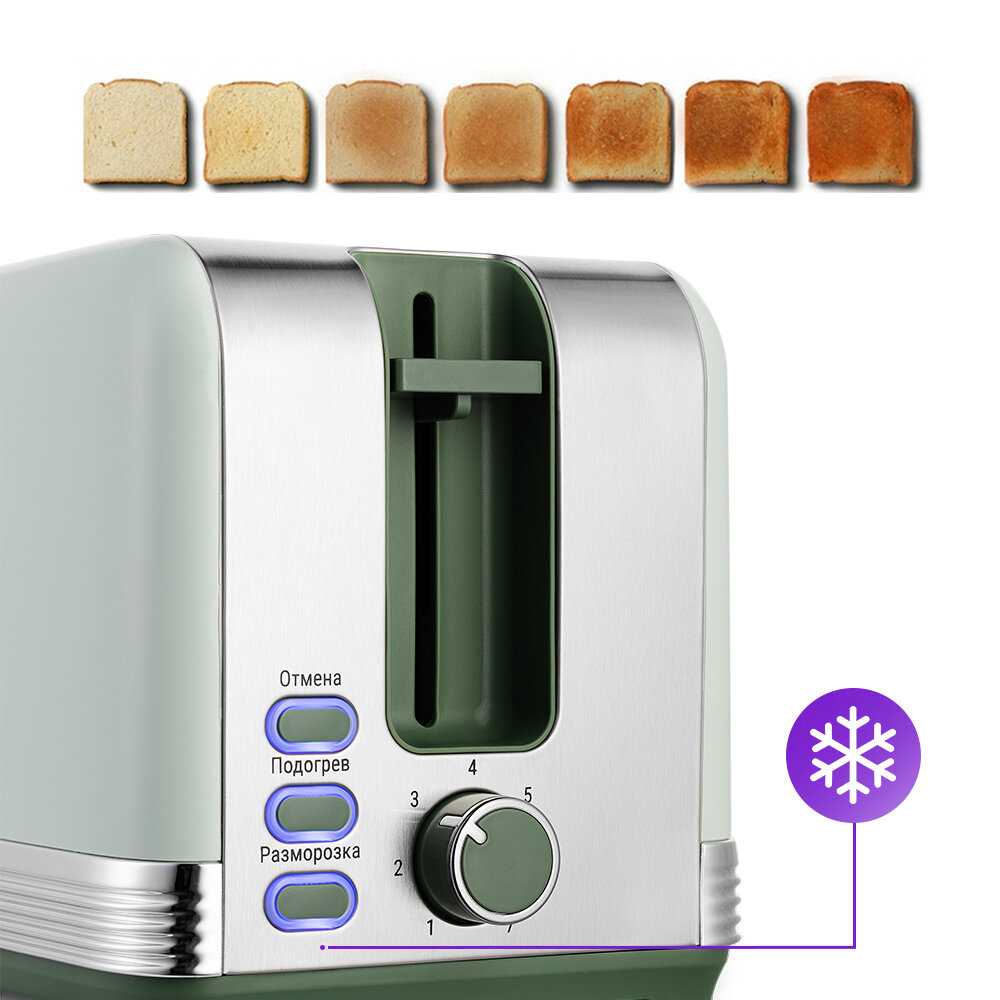 - Функция разморозки обеспечивает равномерную прожарку замороженного хлеба без пересушивания сердцевины, сохраняя мягкость внутри.