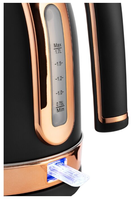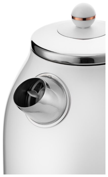 Купили чайник на замену старому, который просто со временем потек. Выбирали долго, так как предложений огромное количество. Сейчас чайников на любой вкус и кошелек. Есть даже "дизайнерские" варианты за нереальные 19000р. Надо сказать, что с точки зрения дизайна данная модель нас и привлекла. Ну во-первых аналоговый измеритель температуры. Смотрится очень красиво. Во-вторых элегантная отделка металлом(в нашем случае белым, но есть и медный вариант) также смотрится очень не навязчиво и очень элегантно. Не хуже чем в дорогущем дизайнерском. Все у чайника прекрасно, но есть и небольшие недостатки. Во-первых нет автоотключения при снятии с основания. Это не всегда удобно, но и не критично. Во вторых корпус чайника достаточно сильно нагревается и если неаккуратно дотронуться, то можно получить небольшой ожог. Справедливости ради надо сказать, что эргономика продумана очень хорошо и что бы получить тот самый ожог надо теще постараться. В конце концов мы все варим суп в металлических кастрюлях и не сетуем на то, что их невозможно взять голыми руками. Немного о той самой эргономике. Ручка сделана очень удобно и даже полностью наполненный чайник поднимать удобно. Струя из носика ровная и без расплескивания позволяет наливать кипяток даже в самую миниатюрную чашку. Светящаяся клавиша включения горит синим светом и очень четко дает понять, что прибор включен. Кстати есть защита от включения пустого прибора, что тоже очень важно. Есть возможность укоротить шнур по вашему усмотрению. Одним словом очень уверенно могу сказать, что чайник стоит своих денег. Кстати покупали мы его в ОНЛАЙН ТРЕЙД, где на тот момент действовала акция от производителя и нам чайник достался с небольшой скидкой. Рекомендую всем, кто не гонится за техническими наворотами в виде подогрева воды до разных температур, но хочет видеть у себя на кухне не просто чайник, а небольшое произведение искусства. Всем хороших покупок. Будем надеяться, что проработает он не меньше своего предшественника.