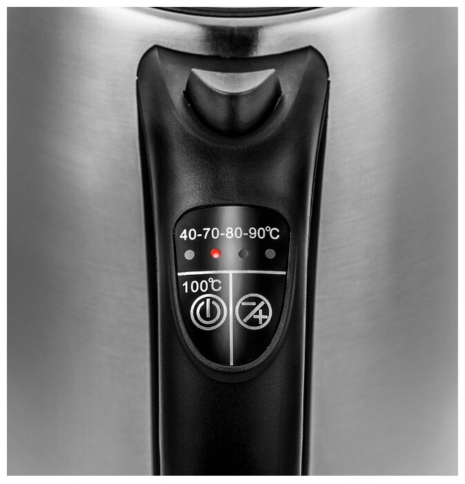 - + Хороший дизайн, возможно выбрать температуру нагрева воды 40-70-80-90-100, каждый режим имеет свою подсветку. При установке на подставку издаёт звуковой сигнал. Объём 1,7 литра достаточный для семьи из трёх- четырёх человек. Металлический корпус и удобная в использовании ручка.