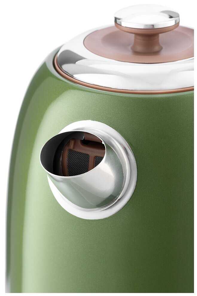 - + Очень красивый дизайн, цвет необычный сочная зелень, удобный носик. Через него не проливается ни капли. Ручка совсем не нагревается, шнур достаточной длины. И конечно ретро термометр, который позволяет нагревать до определённой температуры. Чайник прекрасно вписывается в интерьер кухни, удобен в использовании, контроль уровня воды всегда под рукой, легко моется. Важное достоинство, что крышка совсем снимается и можно наливать воду с любого положения чайника. Оптимальный объем для семьи из двух-трех человек, хватает на всех по 2 чашки. Закипает очень быстро и совсем не шумит. Флажок для включения кипячения очень удобный, отключается моментально при закипании, вращение на подставке на 360 градусов позволяет размещать чайник в удобном положении. Крышка снимается легко, без напряжения, ручка на крышке прочная и удобная, не нагревается при кипячении. Великолепное сочетание зеленого, кофейного цвета и серебристого в дизайне. Большое достоинство-это вес изделия, чайник очень лёгкий пустой и совсем не тяжелый при заполнении объёма по максимуму, то есть 1.7 литра. Большой плюс это пластиковая сеточка в носике, которая фильтрует воду от накипи, легко вынимается, моется. Выбирали из многих различных вариантов. Но остановились на этом красочном экземпляре из-за необычной формы, удобного носика, прекрасного цвета. Моется легко, пятен на корпусе и на ручке не оставляет, крышечка тоже сияет. Спасибо большое производителю за прекрасную кухонную технику, обязательно буду заказывать еще что-нибудь в таком же цвете и дизайне, искренне надеюсь что чайник прослужит долго и сохранит свою привлекательность. Рекомендую к покупке, потому что эта модель впишется в любой интерьер кухни или гостиной , удобный объем 1,7 литра, который быстро нагревается и используется на несколько напитков, простота в обращении и уходе. Данную модель покупали первый раз и надеемся на дальнейшее сотрудничество. Инструкция по эксплуатации написана доступно, активируется гарантия, и отдельное спасибо за подарки !.