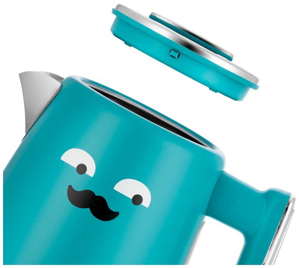 - + Хороший,довольно добротный чайник. Приятный бирюзовый цвет.Хорошо держится в руке.Четко показывает температуру воды. Крышка съемная,что позволяет мыть чайник внутри.В меру шумит при нагреве.Пластик хорошего качества.Очень приглянулась аппликация (похоже чем-то ,усами,на меня).