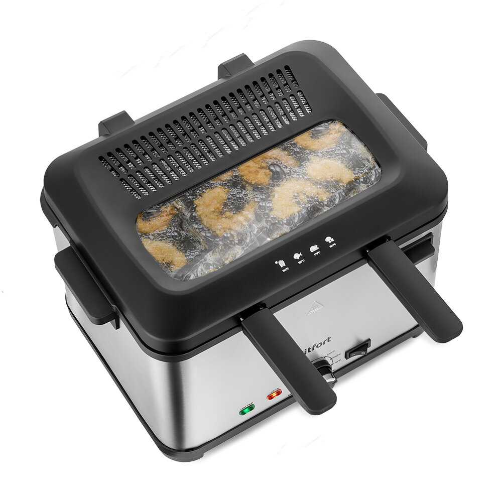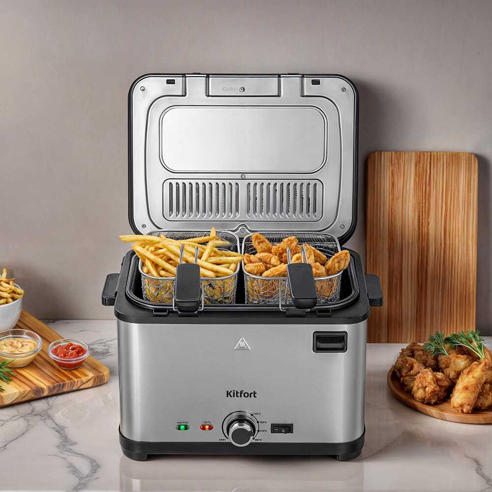 Корпус изготовлен из комбинации металла и термостойкого пластика, обеспечивающего долговечность. Антипригарное покрытие чаши упрощает очистку и предотвращает пригорание. Ручки корзин остаются холодными при работе, а устойчивое основание исключает смещение на столешнице.