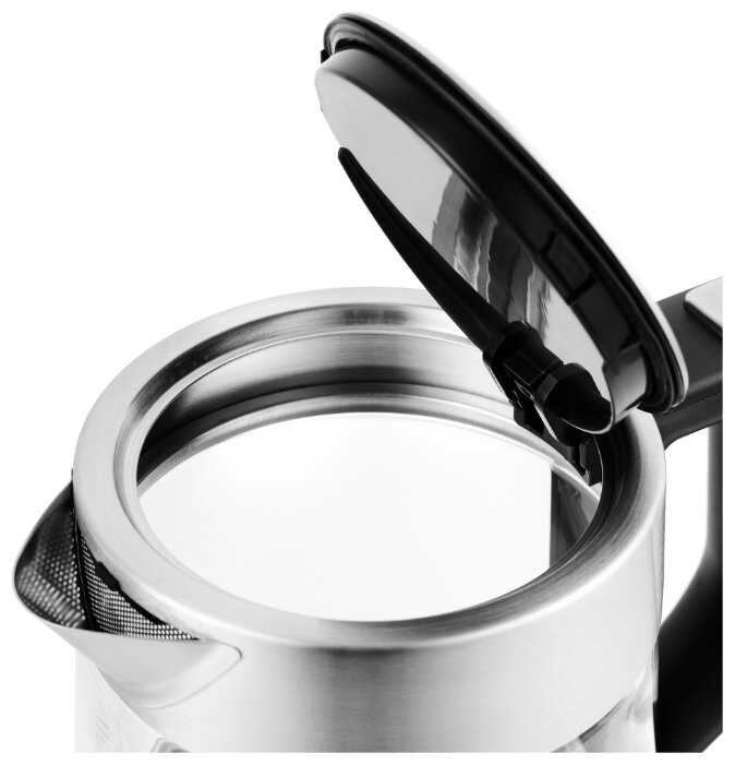 Все внутренние части чайника выполнены из металла (в т.ч. и ситечко, которое снимается поворотом), не шумит при нагреве. Крышка закрывается плотно, нет механизма открывания, который выходит из строя в первую очередь.