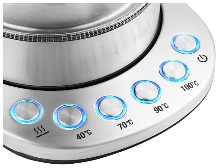 - + Чайник очень понравился. Покупала в подарок, на желтую кухню вписался идеально. Главное достоинство, на мой взгляд, то что чайник довольно тихий. Шумит слабо, после нагрева воды издает несколько таких же тихих писков. Ранним утром или поздним вечером можно не бояться кого-нибудь разбудить шумом работы прибора. Особенно подойдёт тем, у кого грудные дети - без проблем воду можно подогреть до 40 градусов, ведь чайник еще греет воду до указанной вами температуры, и ни градусом больше. Управляется сенсорной кнопкой слева от дисплея. Указываете нужную вам, тыкая по кнопке один/несколько раз и наслаждаетесь современными технологиями) Текущая температура воды, кстати, всегда показывается на дисплее, что тоже очень удобно. Есть также термопот: чайник будет поддерживать определённую температуру воды в течение 4 часов.