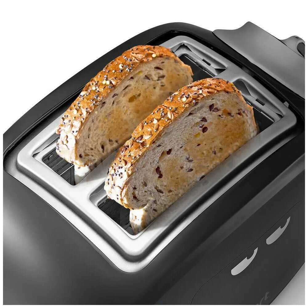 - + Красивый дизайн, хорошо жарит, прикольная картинка на хлебушке, а так же удобно что есть лоток для крошек, ну и конечно цена доступная!
