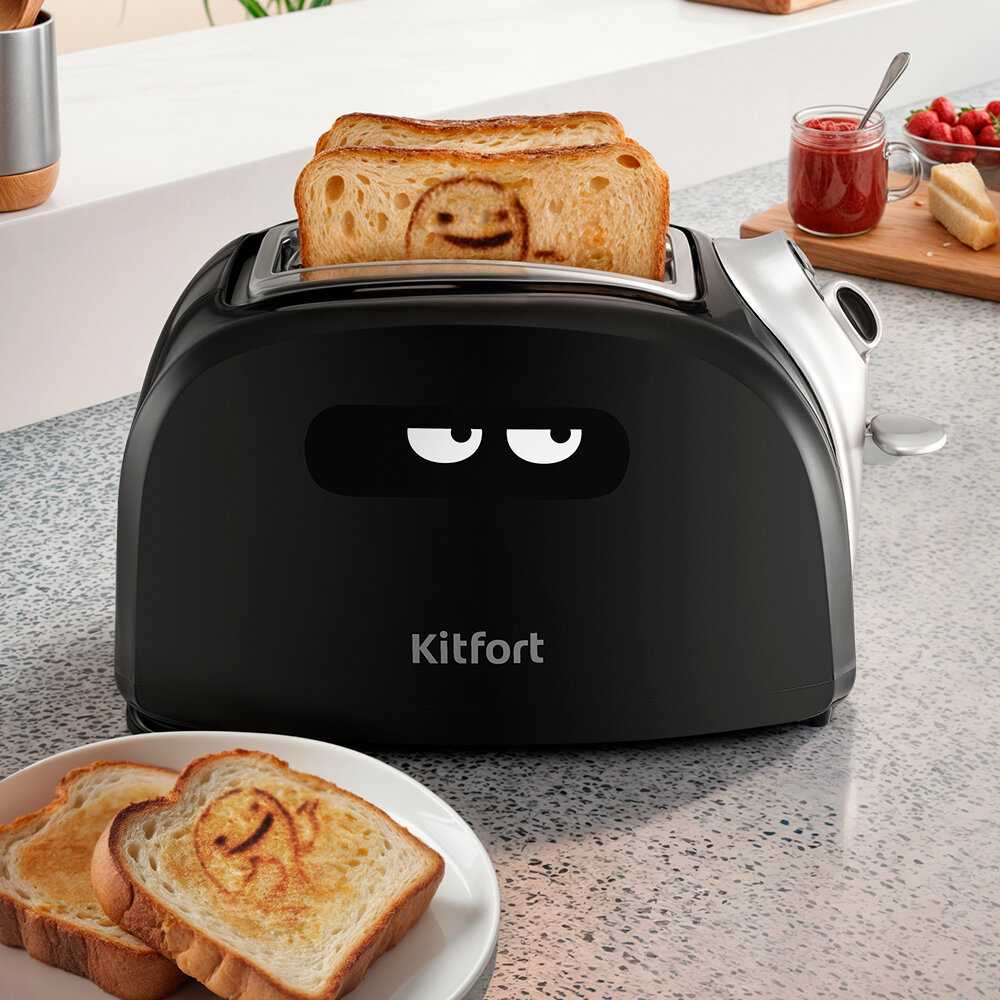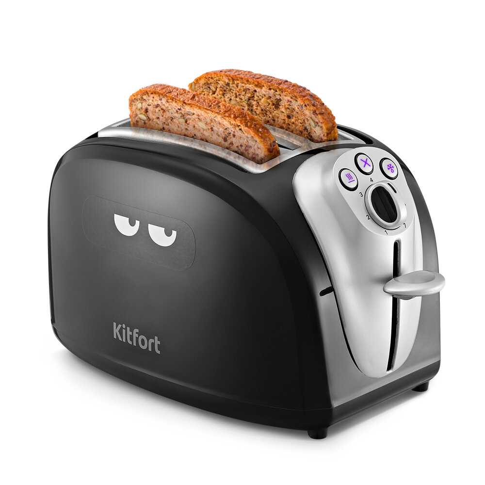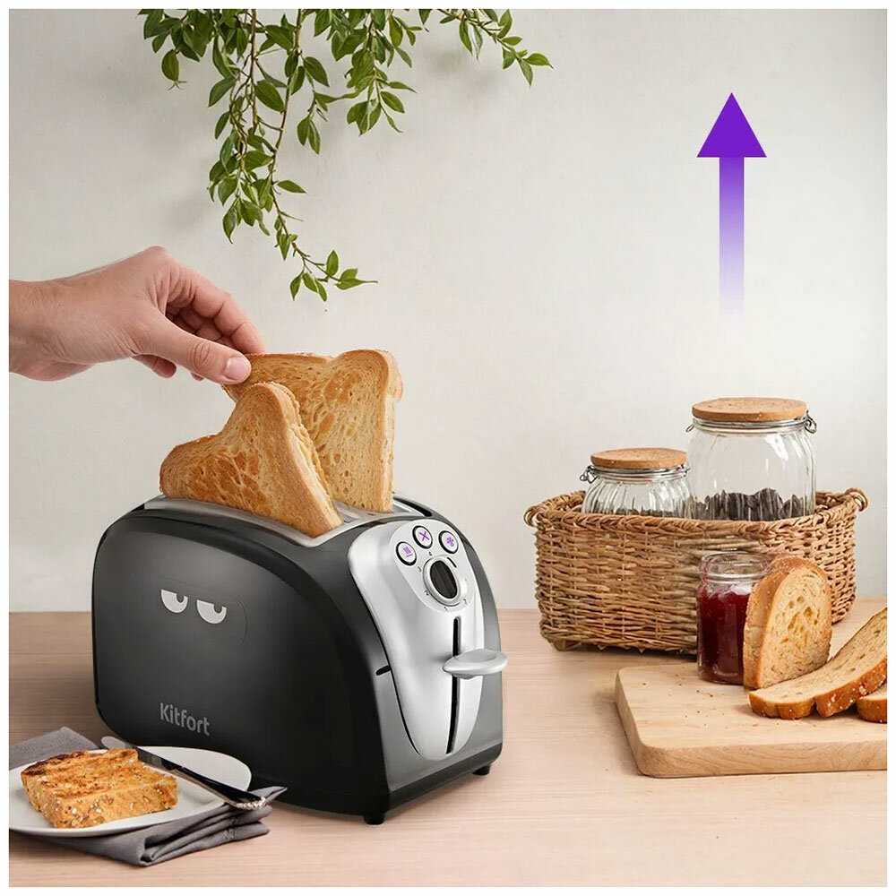 Тостер Kitfort прекрасно справляется с поставленной ему задачей. Лучше всего в нем получаются тосты из батона и сдобной булки - их лучше делать в режиме времени 4-5. Из хлеба лучше жарить на отметке 6-7 и если хочется поподжаристей, то можно еще допечь на отметке 3. Опытным путем установлено, что "6" занимает по времени 150 секунд.