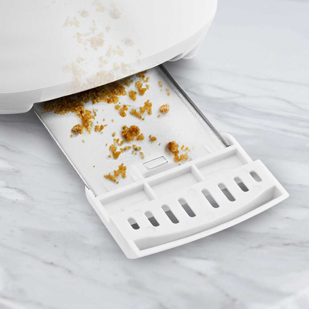 Съемный поддон для крошек легко вытаскивать и чистить после использования. Пользователи отмечают это как один из главных плюсов, так как крошки от хлеба или булочек собираются в нем удобно. Чистка занимает минимум времени, и тостер всегда остается опрятным. Это делает уход простым даже для ежедневного применения.