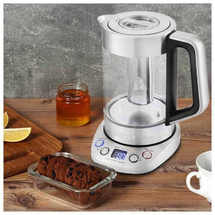 - + Очень удобный и красивый чайник. Отличная возможность для заваривания прямо в чайнике (укомплектован специальным заварочником из нержавейки) . Понятная и простая настройка необходимых способов заваривания. Дисплей с показателями температуры помогает подогреть воду до необходимых значений и не перегреть её. С большим удовольствием рекомендую к покупке.