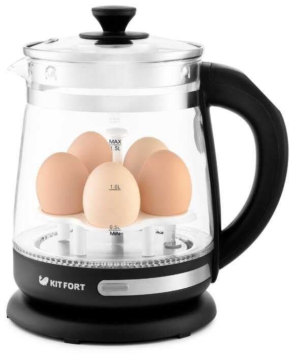 В данном чайнике можно сварить до 5-ти яиц, используя круглую подставку светлого пластика с насадкой для выемки после варки.Подставка с яйцами ставится на дно чайника и в течение 10-12 минут происходит варка яиц. Затем подставка с яйцами вынимается из чайника и в таком виде может быть установлена на кухонный стол,например,для утреннего завтрака. Очень удобно.