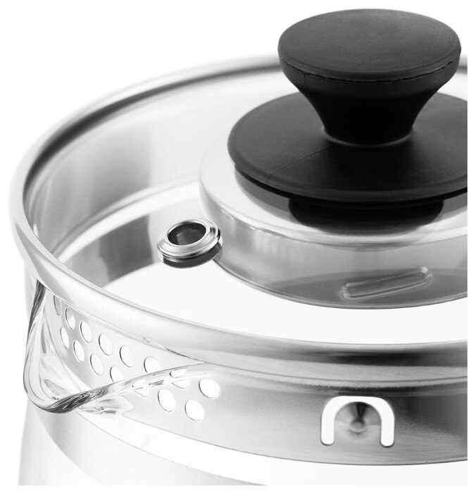 И напоследок. Если Вам захочится устроить чаепитие в кругу семьи и нужен большой объём заваренного чая для всех, этот чайник справится и с этой задачей, поскольку он имеет фильтр для чая в виде сетчатой колбы, которая пристыковывается и фиксируется с обратной стороны крышки чайника. В колбу насыпается заварка- дожидаемя окончания заваривания и вуаля-вкусный чай для для всей семьи готов.