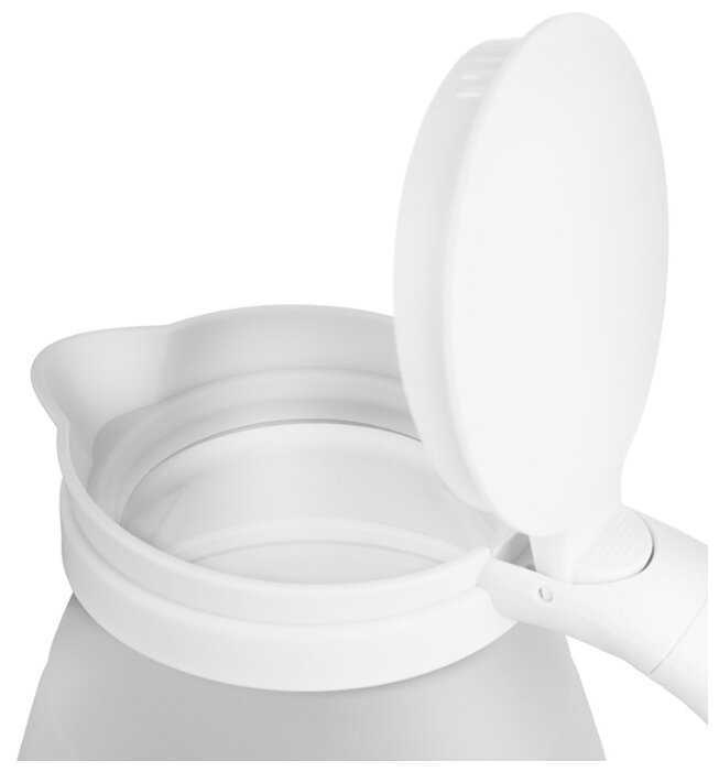 Чайник куплен для поездок взамен советского кипятильника, неудобно греть им воду по одной чашке (например, на чай и кашу) и не отходить от него в целях безопасности. Здесь таких проблем нет: закипает вода быстрее, сразу на 2 чашки, отключается сам, а если отвлечься, будет работать как термопот – не нужно тратить время на повторный нагрев. Воду заливать удобно, горлышко не узкое, метка максимального объема совпадает с верхним сгибом корпуса, даже присматриваться не нужно. Длины шнура волне хватает. Крышка чайника закрывается легко, а силикон корпуса плотный - опасений случайно сложить чайник с водой, закрывая крышку, нет. Запах силикона после нескольких кипячений исчез, на вкус воды материал корпуса никак не влияет. За 7 месяцев использования чайник полностью оправдал ожидания.