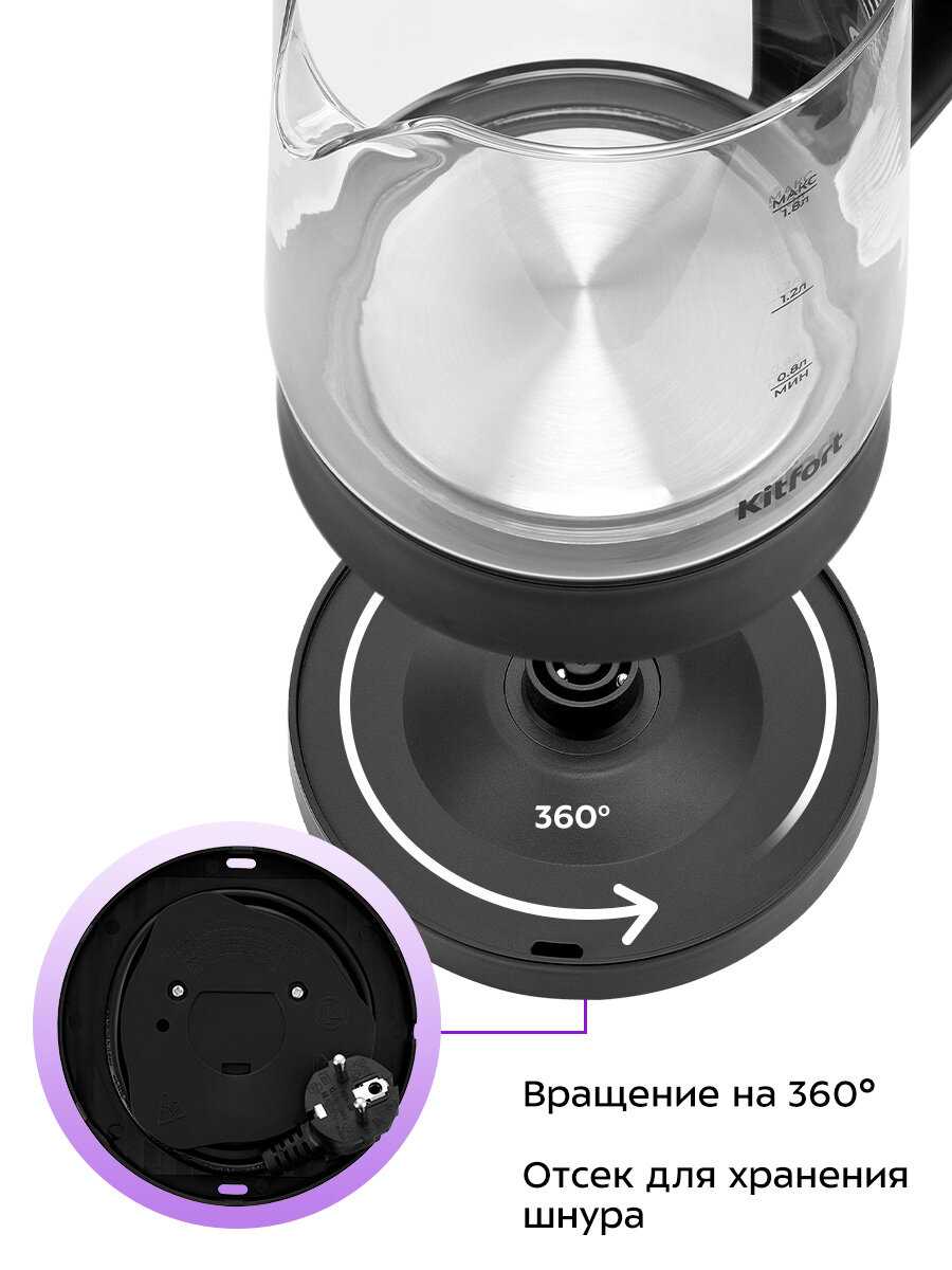| Особенности : | вращение на 360 градусов, двойные стенки, индикатор уровня воды, индикация включения, отсек для хранения шнура, сенсорное управление, съемная крышка |