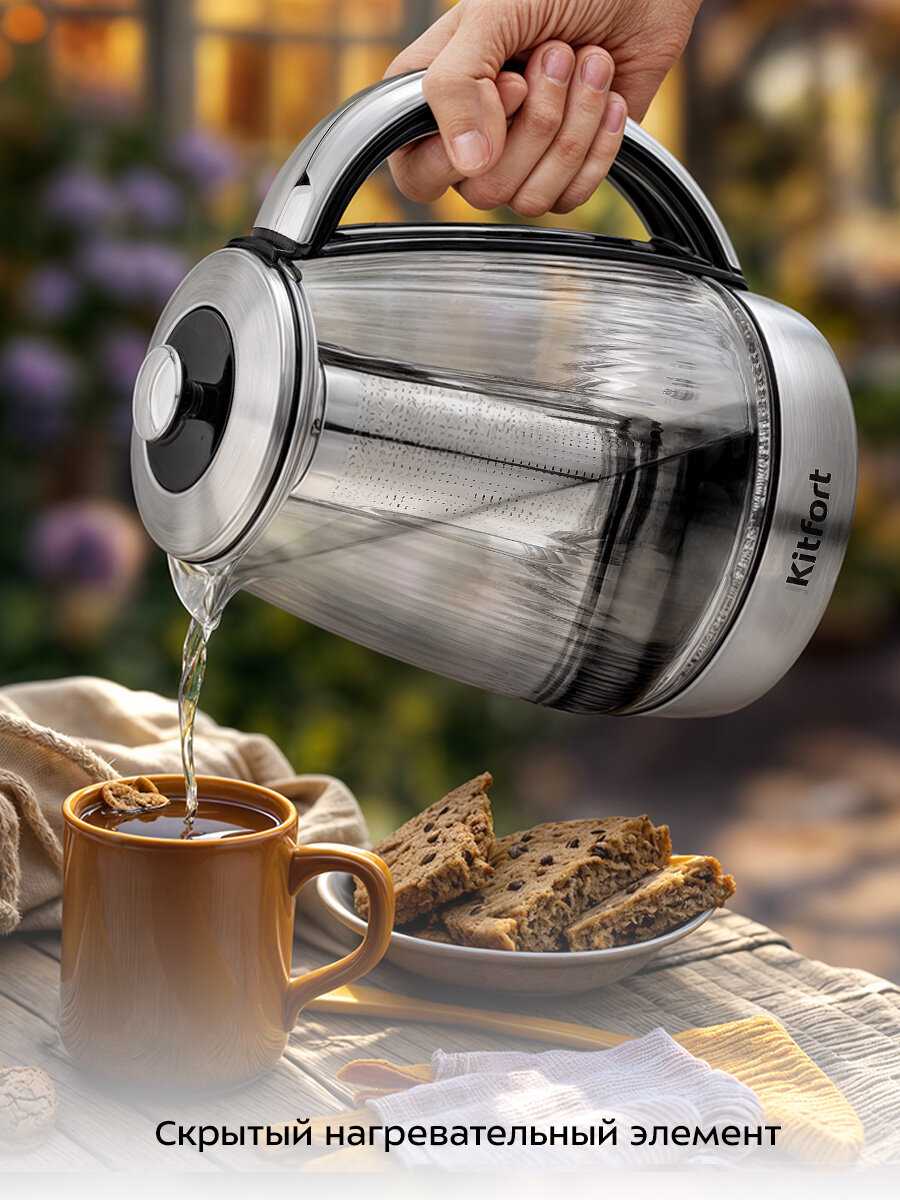 - + Этот чайник тихий в работе, что особенно заметно при использовании. Внешний вид привлекательный, а дисплей позволяет легко отслеживать температуру воды, что добавляет удобства. Еще один приятный момент - наличие специальной чаши для заваривания чая или кофе прямо внутри. Объем 1,7 литра идеально подходит для компании друзей на даче в беседке.