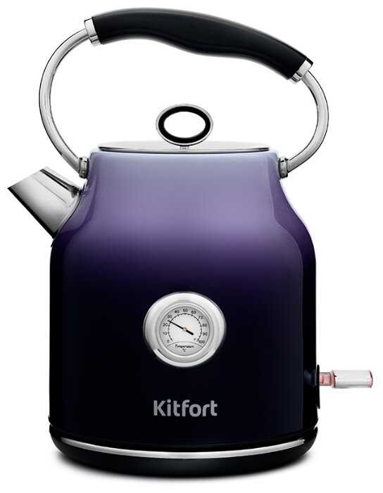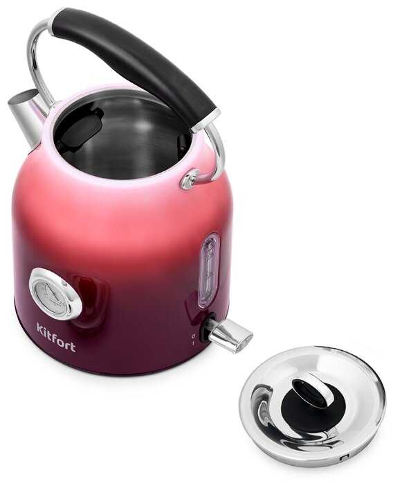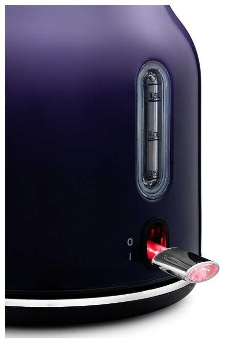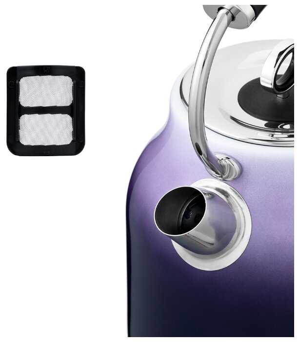 - + Очень стильный дизайн,покупали фиолетовый, переходящий цвет в реальности красивее, чем на картинке. Очень понравилось, то что при широком носике, вода льется на половину и не разбрызгивается, перед носиком фильтр, что позволяет даже при наличии накипи не попадать ей в чашку. Закипает очень быстро, бесшумный. Есть датчик температуры, датчик количества воды. Очень вместительный, но не тяжелый. Покупкой довольна