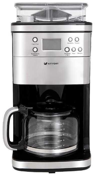 - + Эта кофемашина Kitfort КТ-705 - вторая. Предыдущая интенсивно проработала 5 лет. Замечательная кофемашина! Но, к сожалению, сломалась встроенная кофемолка. И вот приобрела точно такую же, потому что у нее только достоинства. Можно задать степень помола зерен, крепость напитка, кличество чашек. Автоматический подогрев. Встроенные часы. Можно также использовать и молотый кофе. Очень удобна в обслуживании: фильтры легко вынимаются и моются. И, наконец, кофемашина красивая, стильная.