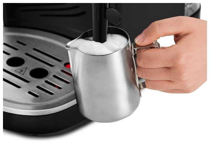 - Режим пара включается отдельной кнопкой, что позволяет одновременно готовить кофе и взбивать молоко.
