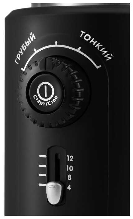 - Кофемолка сама определяет время работы по выбранным настройкам (количество чашек и степень помола) и выключается, избавляя от необходимости держать кнопку или засекать секунды.