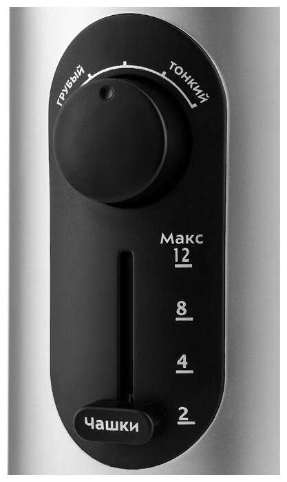 - Внутри чаши есть мерная шкала для количества зерен (от 2 до 12 чашек), что помогает точно дозировать продукт и избегать переполнения.