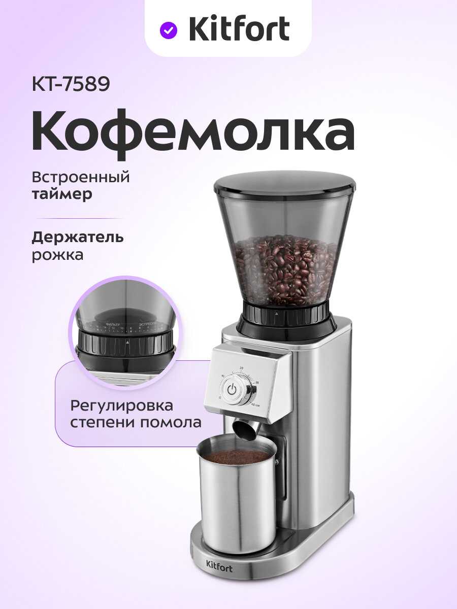 Kitfort КТ-7589 — это прекрасное соотношение цены и качества. Она выполняет свою основную функцию на твердую пятерку. Не гонится за модными «умными» фишками, а просто хорошо делает свою работу: быстро, равномерно и надежно измельчает. 24 степени помола, 150 Вт. Рекомендую всем, кто ищет недорогую, но добротную кофемолку для дома.