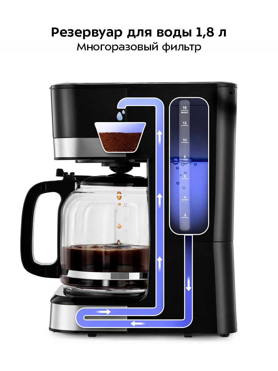 Купил эту кофевраку и очень доволен! Удобный резервуар на 1,8 л и чёткая шкала делают процесс простым и понятным .За пару минут получает вкусный, ароматный кофе — регулировка крепости отлично работает. Всё легко чистить и мыть — корпус и колба снимаются без проблем . Плюс, упаковка надёжная, уже второй прибор этой фирмы — служит без нареканий  Отличный выбор за свою цену!
