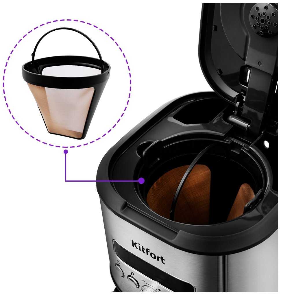 - Сетчатый фильтр из нержавеющей стали исключает необходимость покупки бумажных аналогов.