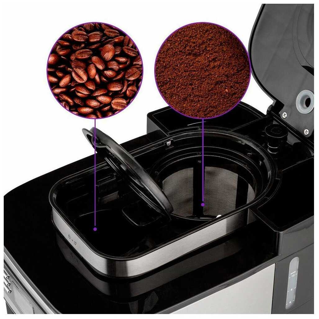 Приготовление ароматного кофе одним нажатием кнопки. Можно использовать два вида кофе - зерновой и молотый среднего помола. Встроенная кофемолка автоматически измельчает кофейные зерна сразу в фильтре. Резервуар для воды емкостью 1 литр обеспечивает возможность приготовить за один раз кофе на 5 больших (200 мл) или 10 маленьких (по 100 мл чашек). Кофейник прозрачный с делениями. Мерная ложка для кофе. Есть режим "Автозапуск", который позволяет начать приготовление кофе в заданное время. После окончания приготовления напитка, автоматически включается подогрев платформы на 30 минут, чтобы кофе не остыл.