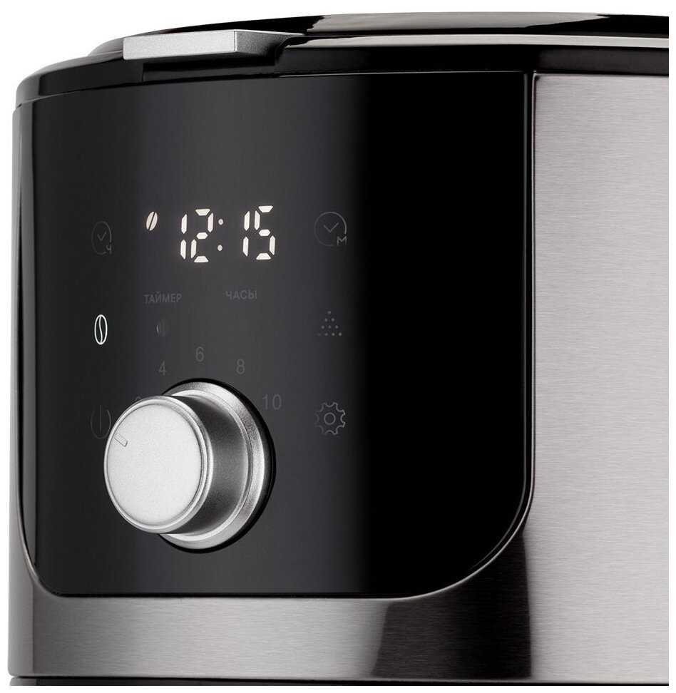 - Таймер с точностью до минуты позволяет запрограммировать приготовление кофе к определенному времени, что ценно для утреннего пробуждения.
