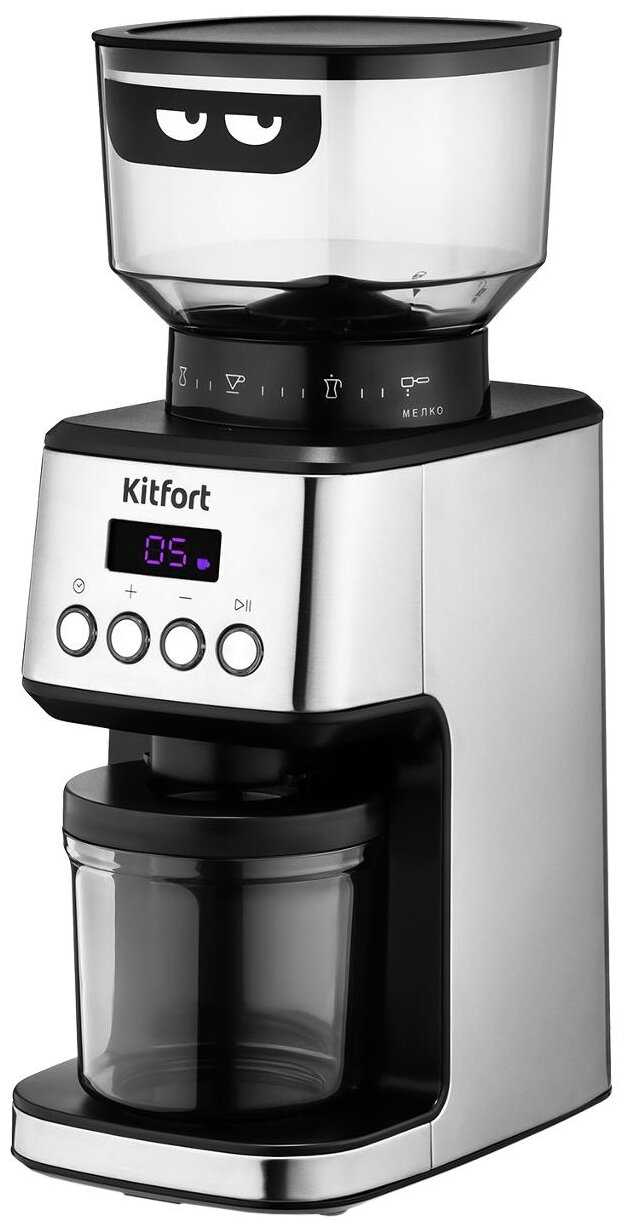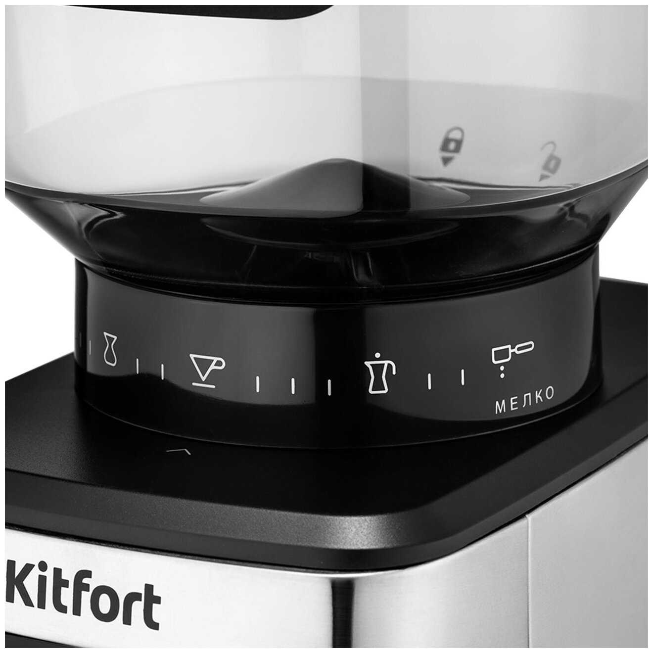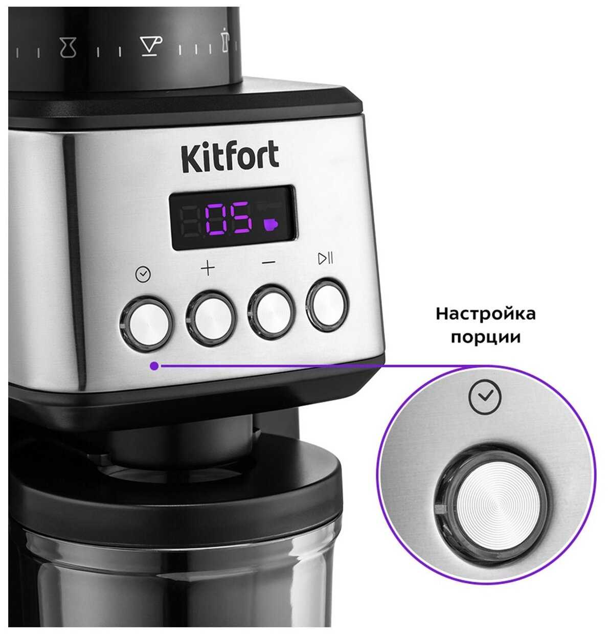 - Конические стальные жернова обеспечивают однородный помол, подходящий для эспрессо, капельной кофеварки и френч-пресса.