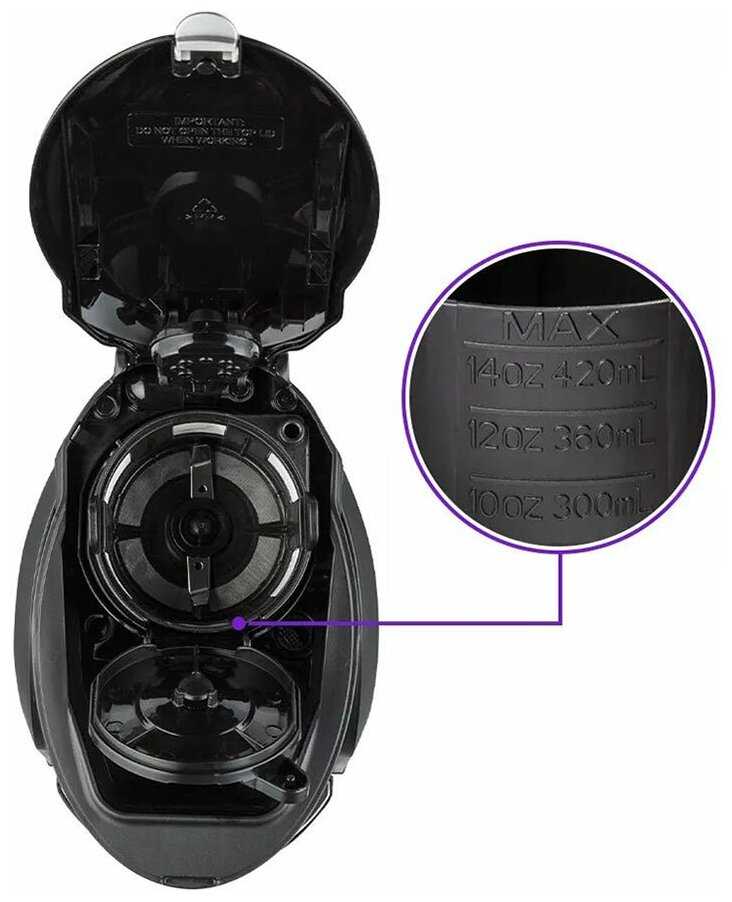 - Объем 480 мл превышает резервуар для воды на 420 мл, предотвращая перелив и обеспечивая порцию для 1-2 человек с запасом.