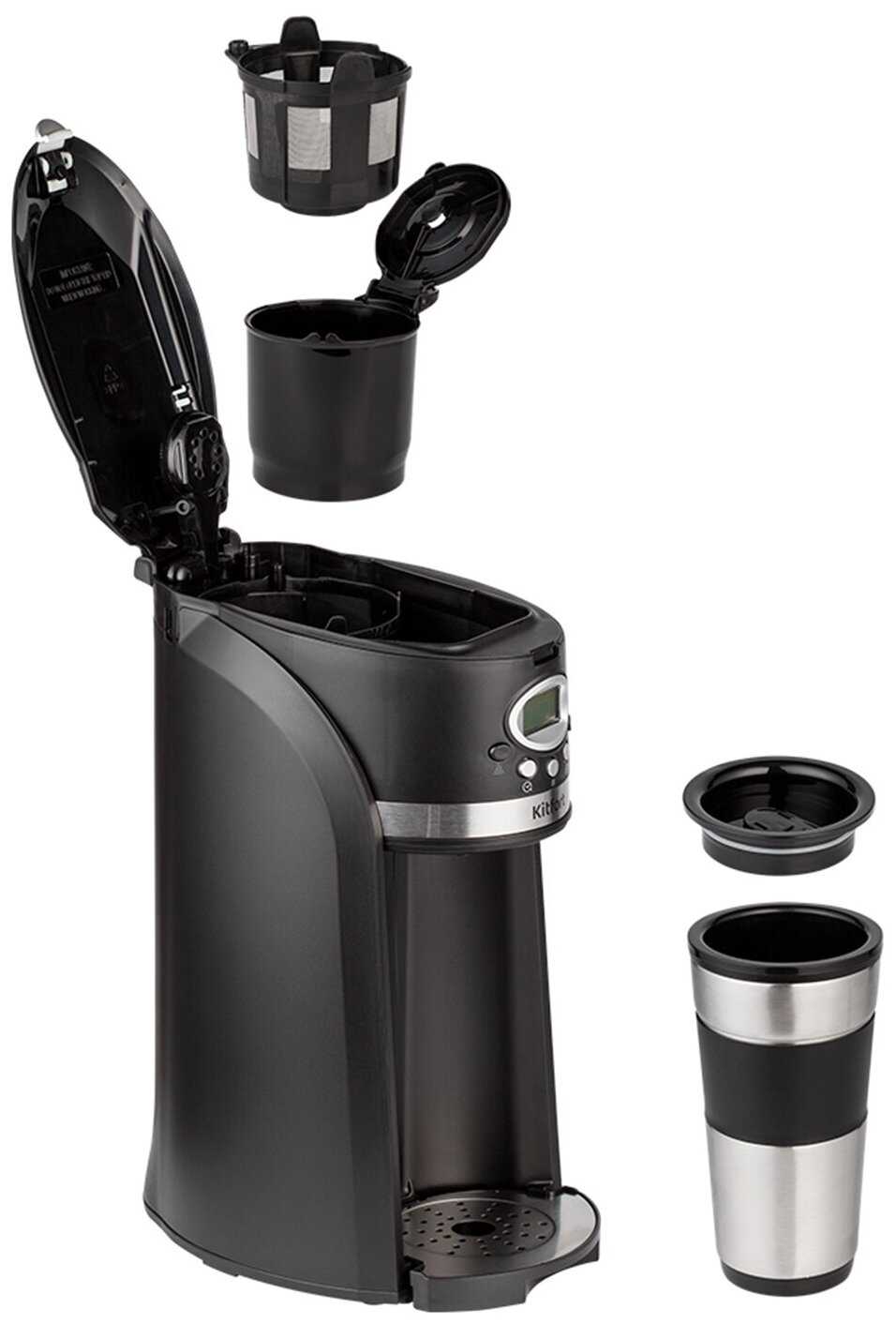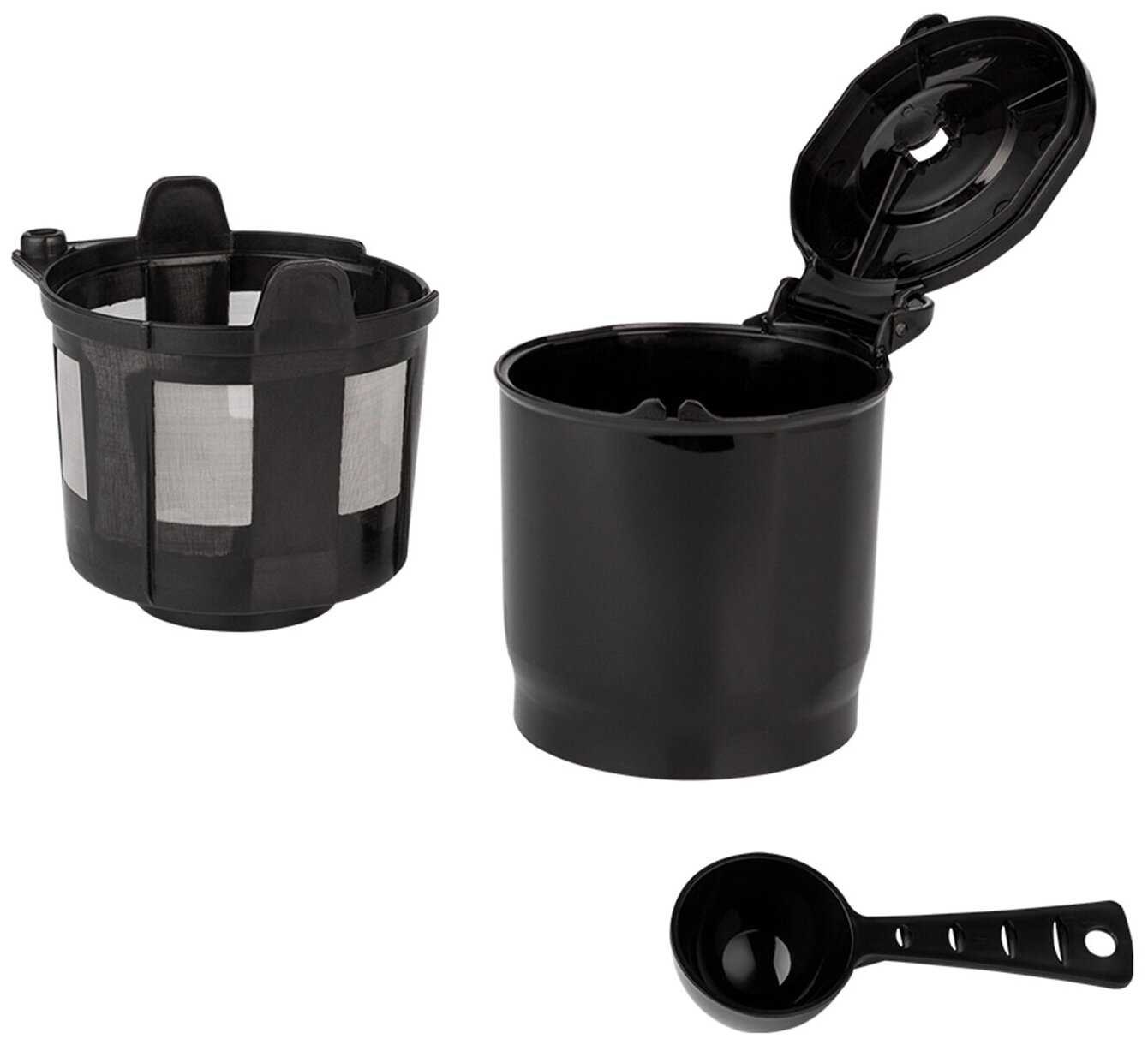 - + Компактная, недорогая, металлический фильтр, термокружка в комплекте, есть кофемолка и таймер