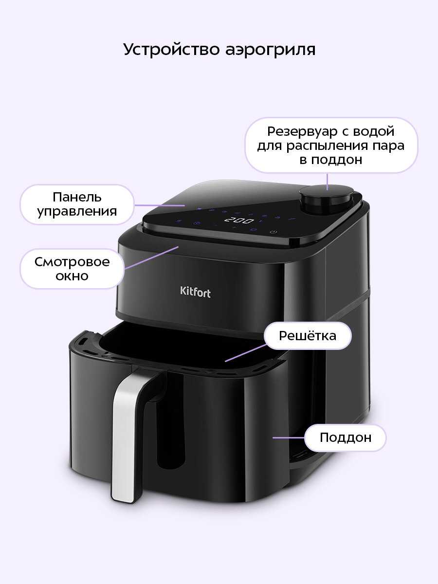 Долго выбирала аэрогриль, остановилась на Kitfort. Очень понравилось, что в этой модели есть функция "пар" и два тэна. Покупкой довольна, готовлю в нем каждый день, все очень вкусное,а главное полезное!