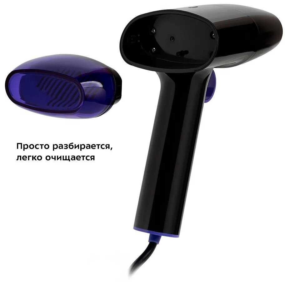 Прибор весом 700 грамм спроектирован по принципу фена с продуманной балансировкой: пользователи отмечают комфортный хват даже при продолжительном использовании. Ключевое преимущество — интеллектуальная кнопка подачи пара с фиксацией, исключающая необходимость постоянного нажатия. Резервуар ёмкостью 110-150 мл расположен вне зоны хвата, что предотвращает нагрев руки, а его съёмная конструкция с герметичным клапаном упрощает заправку. Длина шнура (не указана в отзывах явно, но критики за малую длину нет) позволяет маневрировать при обработке штор или верхней одежды. Однако отсутствие подставки для остывания после работы признано незначительным недостатком.