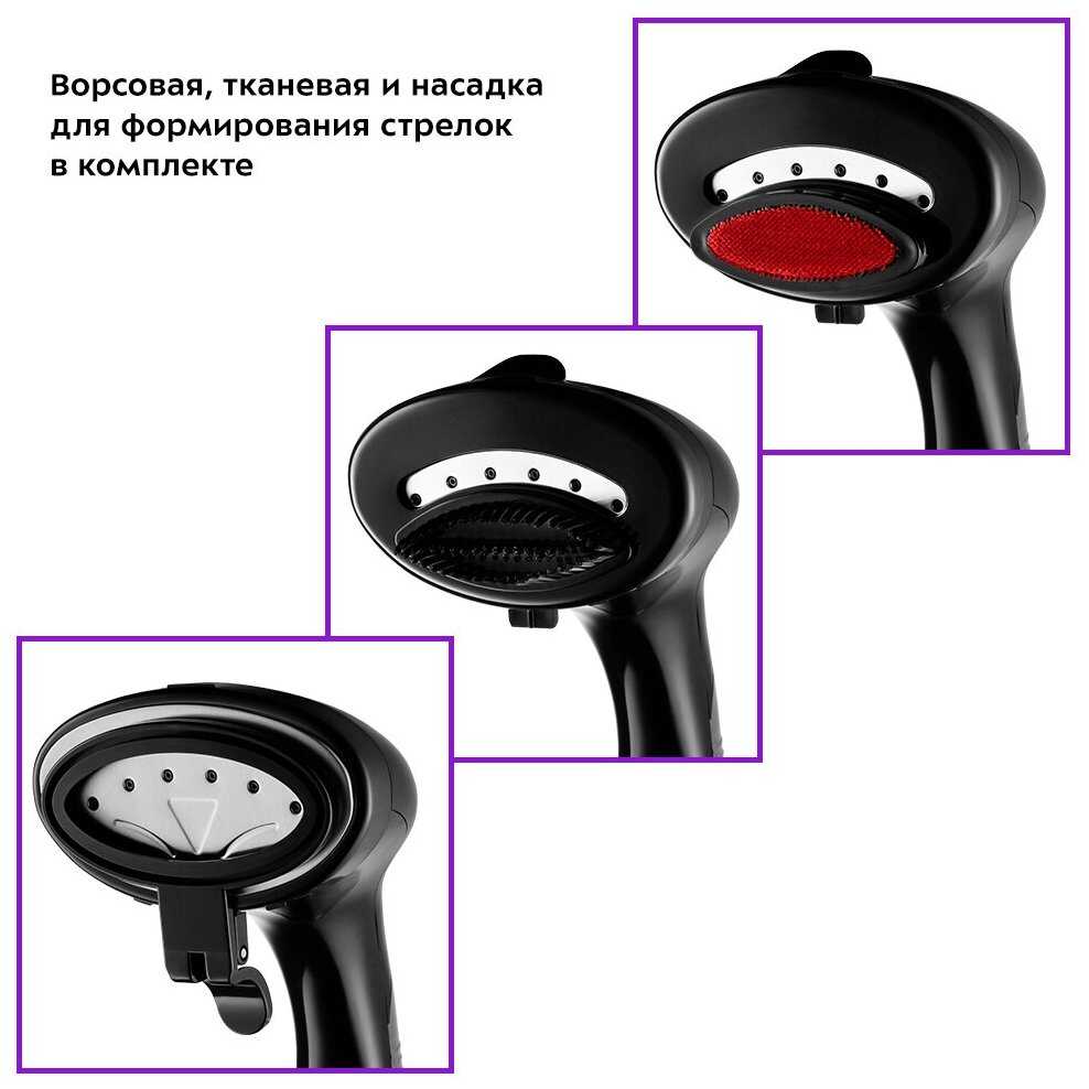 - В комплекте три насадки: стандартная (для большинства тканей), узкая (для труднодоступных участков) и щипцы для фиксации стрелок на брюках.
