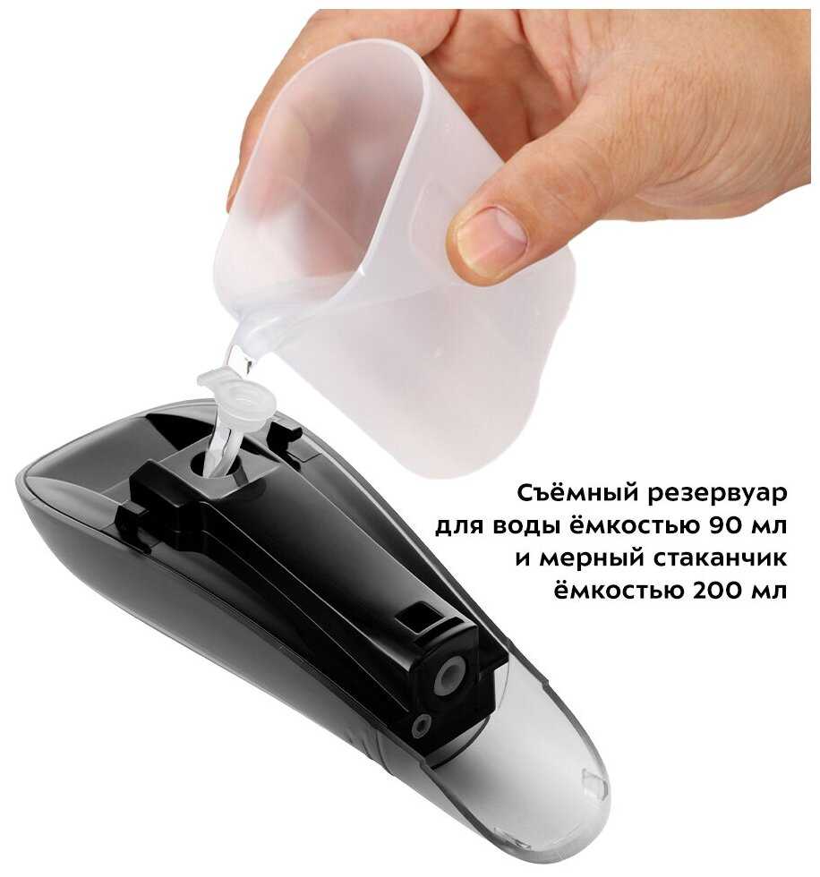 - Съемный резервуар для воды (80 мл) минимизирует риск пролива при заправке.